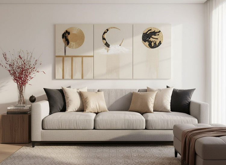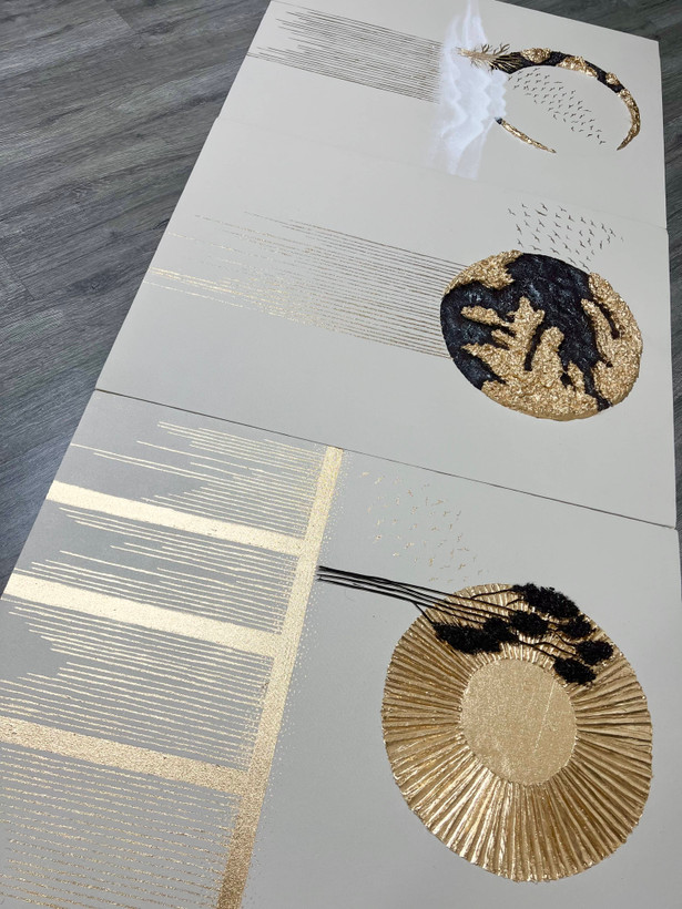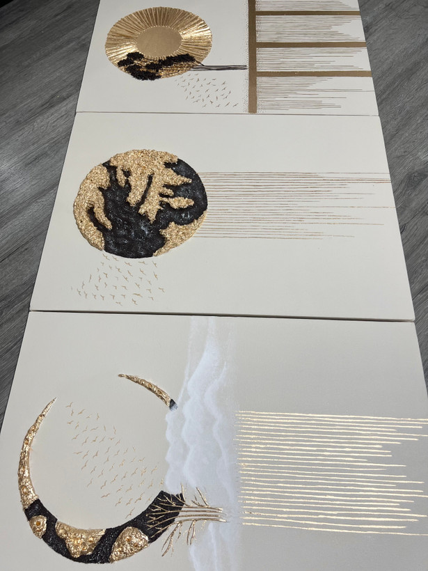 تابلو دکوراتیو برجسته ماه و خورشید و زمین/ کار شده با تکسچر سرامیک، رنگ اکریلیک، ورق طلا/ قابل اجرا در رنگ ها و سایزهای مختلف/برای سفارش در رنگ ها و ابعاد دلخواه با شماره 09357129452 تماس حاصل فرمایید.