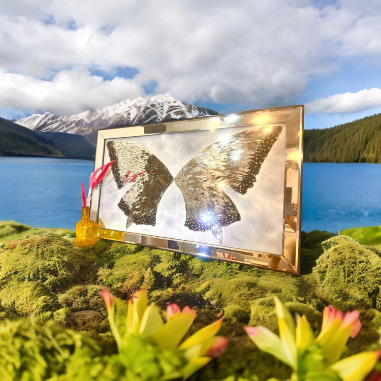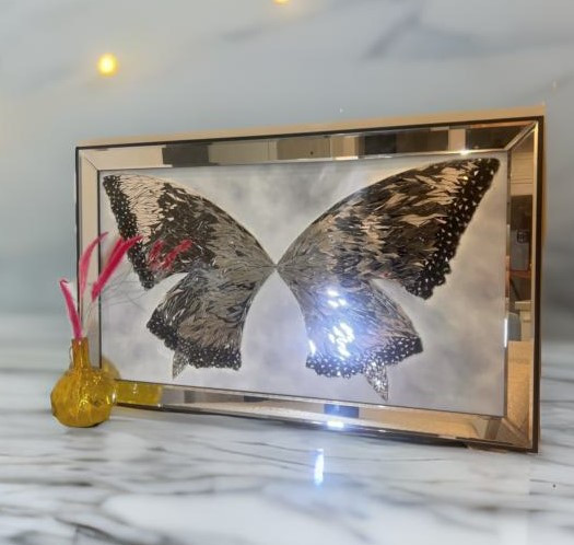 تابلوی آینه کاری پروانه کار شده با برش های آینه 1.2 میل/ برجسته شده با تکسچر/ زمینه ابر و بادی رنگ و روغن/ برای سفارش در رنگ و سایز دلخواه با شماره 09357129452 تماس حاصل فرمایید.